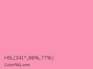 HSL 341°,88%,77% Color is a light rose color and the nearest color is Schauss Pink #ff91af. Hex code #f891b2 and RGB value is rgb(248,145,178). In RGB color space, this color is composed of 97% red, 57% green, 70% blue, In CMYK color space, this color is composed of 0% cyan, 42% magenta, 28% yellow , 3% black , In HSL color space, this color has a hue angle of 341° , 88% saturation and 77% lightness.