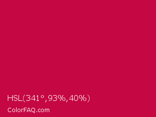 HSL 341°,93%,40% Color is a normal rose color and the nearest color is Pictorial Carmine #c30b4e. Hex code #c50743 and RGB value is rgb(197,7,67). In RGB color space, this color is composed of 77% red, 3% green, 26% blue, In CMYK color space, this color is composed of 0% cyan, 96% magenta, 66% yellow , 23% black , In HSL color space, this color has a hue angle of 341° , 93% saturation and 40% lightness.