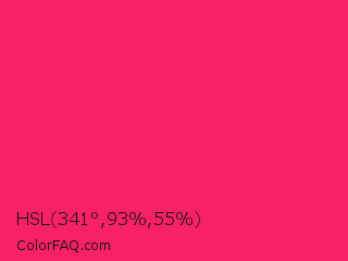 HSL 341°,93%,55% Color is a normal rose color and the nearest color is Awesome #ff2052. Hex code #f72165 and RGB value is rgb(247,33,101). In RGB color space, this color is composed of 97% red, 13% green, 40% blue, In CMYK color space, this color is composed of 0% cyan, 87% magenta, 59% yellow , 3% black , In HSL color space, this color has a hue angle of 341° , 93% saturation and 55% lightness.
