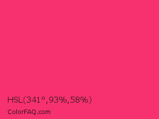 HSL 341°,93%,58% Color is a normal rose color and the nearest color is Radical Red #ff355e. Hex code #f7306f and RGB value is rgb(247,48,111). In RGB color space, this color is composed of 97% red, 19% green, 44% blue, In CMYK color space, this color is composed of 0% cyan, 81% magenta, 55% yellow , 3% black , In HSL color space, this color has a hue angle of 341° , 93% saturation and 58% lightness.