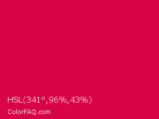 HSL 341°,96%,43% Color is a normal rose color and the nearest color is UA Red #d9004c. Hex code #d70447 and RGB value is rgb(215,4,71). In RGB color space, this color is composed of 84% red, 2% green, 28% blue, In CMYK color space, this color is composed of 0% cyan, 98% magenta, 67% yellow , 16% black , In HSL color space, this color has a hue angle of 341° , 96% saturation and 43% lightness.