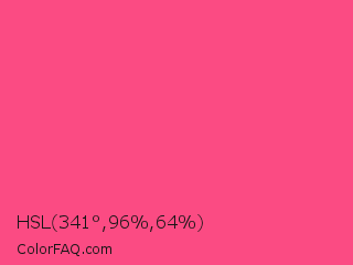 HSL 341°,96%,64% Color is a light rose color and the nearest color is Sasquatch Socks #ff4681. Hex code #fb4b83 and RGB value is rgb(251,75,131). In RGB color space, this color is composed of 98% red, 29% green, 51% blue, In CMYK color space, this color is composed of 0% cyan, 70% magenta, 48% yellow , 2% black , In HSL color space, this color has a hue angle of 341° , 96% saturation and 64% lightness.