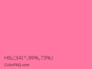 HSL 341°,99%,73% Color is a light rose color and the nearest color is French Pink #fd6c9e. Hex code #fe76a1 and RGB value is rgb(254,118,161). In RGB color space, this color is composed of 100% red, 46% green, 63% blue, In CMYK color space, this color is composed of 0% cyan, 54% magenta, 37% yellow , 0% black , In HSL color space, this color has a hue angle of 341° , 99% saturation and 73% lightness.