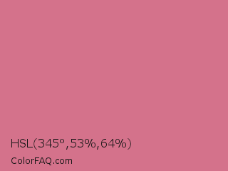 HSL 345°,53%,64% Color is a light red color and the nearest color is Charm #d47494. Hex code #d4728b and RGB value is rgb(212,114,139). In RGB color space, this color is composed of 83% red, 45% green, 55% blue, In CMYK color space, this color is composed of 0% cyan, 46% magenta, 34% yellow , 17% black , In HSL color space, this color has a hue angle of 345° , 53% saturation and 64% lightness.
