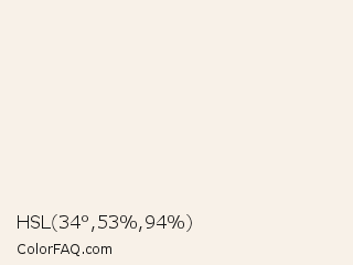 HSL 34°,53%,94% Color is a very light orange color and the nearest color is White Linen #f8f0e8. Hex code #f8f1e8 and RGB value is rgb(248,241,232). In RGB color space, this color is composed of 97% red, 95% green, 91% blue, In CMYK color space, this color is composed of 0% cyan, 3% magenta, 6% yellow , 3% black , In HSL color space, this color has a hue angle of 34° , 53% saturation and 94% lightness.