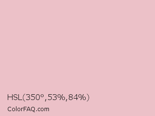 HSL 350°,53%,84% Color is a very light red color and the nearest color is Cameo Pink #efbbcc. Hex code #ecc1c8 and RGB value is rgb(236,193,200). In RGB color space, this color is composed of 93% red, 76% green, 78% blue, In CMYK color space, this color is composed of 0% cyan, 18% magenta, 15% yellow , 7% black , In HSL color space, this color has a hue angle of 350° , 53% saturation and 84% lightness.