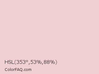 HSL 353°,53%,88% Color is a very light red color and the nearest color is Queen Pink #e8ccd7. Hex code #f1d0d4 and RGB value is rgb(241,208,212). In RGB color space, this color is composed of 95% red, 82% green, 83% blue, In CMYK color space, this color is composed of 0% cyan, 14% magenta, 12% yellow , 5% black , In HSL color space, this color has a hue angle of 353° , 53% saturation and 88% lightness.