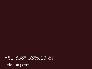 HSL 358°,53%,13% Color is a very dark red color and the nearest color is Tamarind #341515. Hex code #331011 and RGB value is rgb(51,16,17). In RGB color space, this color is composed of 20% red, 6% green, 7% blue, In CMYK color space, this color is composed of 0% cyan, 69% magenta, 67% yellow , 80% black , In HSL color space, this color has a hue angle of 358° , 53% saturation and 13% lightness.