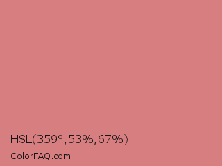 HSL 359°,53%,67% Color is a light red color and the nearest color is New York Pink #d7837f. Hex code #d77e80 and RGB value is rgb(215,126,128). In RGB color space, this color is composed of 84% red, 49% green, 50% blue, In CMYK color space, this color is composed of 0% cyan, 41% magenta, 40% yellow , 16% black , In HSL color space, this color has a hue angle of 359° , 53% saturation and 67% lightness.