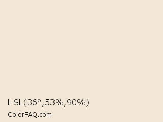 HSL 36°,53%,90% Color is a very light orange color and the nearest color is Eggshell #f0ead6. Hex code #f3e8d8 and RGB value is rgb(243,232,216). In RGB color space, this color is composed of 95% red, 91% green, 85% blue, In CMYK color space, this color is composed of 0% cyan, 5% magenta, 11% yellow , 5% black , In HSL color space, this color has a hue angle of 36° , 53% saturation and 90% lightness.