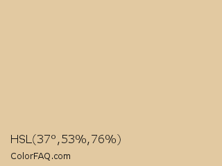 HSL 37°,53%,76% Color is a light orange color and the nearest color is Sapling #ded4a4. Hex code #e2c9a1 and RGB value is rgb(226,201,161). In RGB color space, this color is composed of 89% red, 79% green, 63% blue, In CMYK color space, this color is composed of 0% cyan, 11% magenta, 29% yellow , 11% black , In HSL color space, this color has a hue angle of 37° , 53% saturation and 76% lightness.
