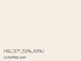 HSL 37°,53%,93% Color is a very light orange color and the nearest color is Merino #f6f0e6. Hex code #f7efe4 and RGB value is rgb(247,239,228). In RGB color space, this color is composed of 97% red, 94% green, 89% blue, In CMYK color space, this color is composed of 0% cyan, 3% magenta, 8% yellow , 3% black , In HSL color space, this color has a hue angle of 37° , 53% saturation and 93% lightness.
