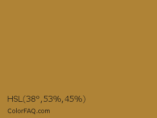 HSL 38°,53%,45% Color is a normal orange color and the nearest color is Luxor Gold #a7882c. Hex code #af8336 and RGB value is rgb(175,131,54). In RGB color space, this color is composed of 69% red, 51% green, 21% blue, In CMYK color space, this color is composed of 0% cyan, 25% magenta, 69% yellow , 31% black , In HSL color space, this color has a hue angle of 38° , 53% saturation and 45% lightness.