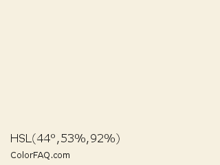 HSL 44°,53%,92% Color is a very light orange color and the nearest color is Quarter Spanish White #f7f2e1. Hex code #f6f0e0 and RGB value is rgb(246,240,224). In RGB color space, this color is composed of 96% red, 94% green, 88% blue, In CMYK color space, this color is composed of 0% cyan, 2% magenta, 9% yellow , 4% black , In HSL color space, this color has a hue angle of 44° , 53% saturation and 92% lightness.