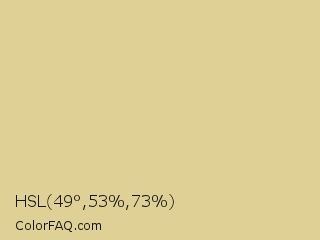 HSL 49°,53%,73% Color is a light yellow color and the nearest color is Zombie #e4d69b. Hex code #dfd196 and RGB value is rgb(223,209,150). In RGB color space, this color is composed of 87% red, 82% green, 59% blue, In CMYK color space, this color is composed of 0% cyan, 6% magenta, 33% yellow , 13% black , In HSL color space, this color has a hue angle of 49° , 53% saturation and 73% lightness.