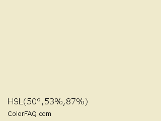 HSL 50°,53%,87% Color is a very light yellow color and the nearest color is Aths Special #ecebce. Hex code #efeacc and RGB value is rgb(239,234,204). In RGB color space, this color is composed of 94% red, 92% green, 80% blue, In CMYK color space, this color is composed of 0% cyan, 2% magenta, 15% yellow , 6% black , In HSL color space, this color has a hue angle of 50° , 53% saturation and 87% lightness.