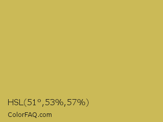 HSL 51°,53%,57% Color is a normal yellow color and the nearest color is Sundance #c9b35b. Hex code #cbba57 and RGB value is rgb(203,186,87). In RGB color space, this color is composed of 80% red, 73% green, 34% blue, In CMYK color space, this color is composed of 0% cyan, 8% magenta, 57% yellow , 20% black , In HSL color space, this color has a hue angle of 51° , 53% saturation and 57% lightness.