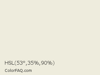 HSL 53°,35%,90% Color is a very light yellow color and the nearest color is Green White #e8ebe0. Hex code #eeecdd and RGB value is rgb(238,236,221). In RGB color space, this color is composed of 93% red, 93% green, 87% blue, In CMYK color space, this color is composed of 0% cyan, 1% magenta, 7% yellow , 7% black , In HSL color space, this color has a hue angle of 53° , 35% saturation and 90% lightness.