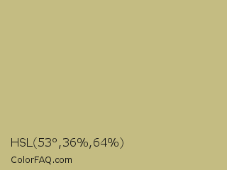 HSL 53°,36%,64% Color is a light yellow color and the nearest color is Sand Ecru #c2b280. Hex code #c4bc82 and RGB value is rgb(196,188,130). In RGB color space, this color is composed of 77% red, 74% green, 51% blue, In CMYK color space, this color is composed of 0% cyan, 4% magenta, 34% yellow , 23% black , In HSL color space, this color has a hue angle of 53° , 36% saturation and 64% lightness.
