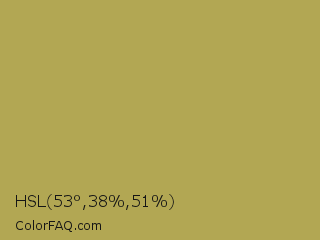 HSL 53°,38%,51% Color is a normal yellow color and the nearest color is Husk #b7a458. Hex code #b2a753 and RGB value is rgb(178,167,83). In RGB color space, this color is composed of 70% red, 65% green, 33% blue, In CMYK color space, this color is composed of 0% cyan, 6% magenta, 53% yellow , 30% black , In HSL color space, this color has a hue angle of 53° , 38% saturation and 51% lightness.