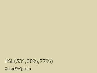 HSL 53°,38%,77% Color is a light yellow color and the nearest color is Hampton #e5d8af. Hex code #dbd6ae and RGB value is rgb(219,214,174). In RGB color space, this color is composed of 86% red, 84% green, 68% blue, In CMYK color space, this color is composed of 0% cyan, 2% magenta, 21% yellow , 14% black , In HSL color space, this color has a hue angle of 53° , 38% saturation and 77% lightness.