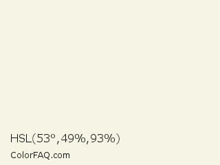 HSL 53°,49%,93% Color is a very light yellow color and the nearest color is Ecru White #f5f3e5. Hex code #f6f4e4 and RGB value is rgb(246,244,228). In RGB color space, this color is composed of 96% red, 96% green, 89% blue, In CMYK color space, this color is composed of 0% cyan, 1% magenta, 7% yellow , 4% black , In HSL color space, this color has a hue angle of 53° , 49% saturation and 93% lightness.