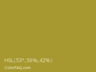 HSL 53°,56%,42% Color is a normal yellow color and the nearest color is Alpine #af8f2c. Hex code #a7992f and RGB value is rgb(167,153,47). In RGB color space, this color is composed of 65% red, 60% green, 18% blue, In CMYK color space, this color is composed of 0% cyan, 8% magenta, 72% yellow , 35% black , In HSL color space, this color has a hue angle of 53° , 56% saturation and 42% lightness.