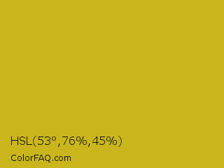 HSL 53°,76%,45% Color is a normal yellow color and the nearest color is Hokey Pokey #c8a528. Hex code #cab61c and RGB value is rgb(202,182,28). In RGB color space, this color is composed of 79% red, 71% green, 11% blue, In CMYK color space, this color is composed of 0% cyan, 10% magenta, 86% yellow , 21% black , In HSL color space, this color has a hue angle of 53° , 76% saturation and 45% lightness.