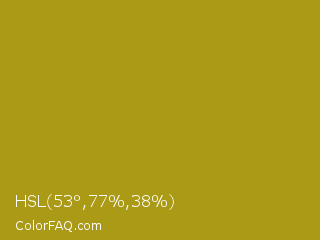 HSL 53°,77%,38% Color is a normal yellow color and the nearest color is Lucky #af9f1c. Hex code #ab9a16 and RGB value is rgb(171,154,22). In RGB color space, this color is composed of 67% red, 60% green, 9% blue, In CMYK color space, this color is composed of 0% cyan, 10% magenta, 87% yellow , 33% black , In HSL color space, this color has a hue angle of 53° , 77% saturation and 38% lightness.
