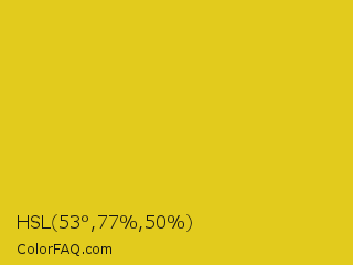 HSL 53°,77%,50% Color is a normal yellow color and the nearest color is Sunflower #e4d422. Hex code #e2cb1d and RGB value is rgb(226,203,29). In RGB color space, this color is composed of 89% red, 80% green, 11% blue, In CMYK color space, this color is composed of 0% cyan, 10% magenta, 87% yellow , 11% black , In HSL color space, this color has a hue angle of 53° , 77% saturation and 50% lightness.
