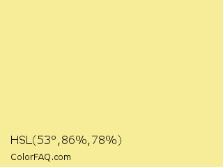 HSL 53°,86%,78% Color is a light yellow color and the nearest color is Flavescent #f7e98e. Hex code #f7ec97 and RGB value is rgb(247,236,151). In RGB color space, this color is composed of 97% red, 93% green, 59% blue, In CMYK color space, this color is composed of 0% cyan, 4% magenta, 39% yellow , 3% black , In HSL color space, this color has a hue angle of 53° , 86% saturation and 78% lightness.