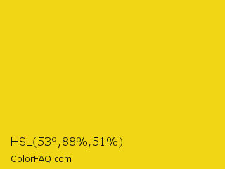HSL 53°,88%,51% Color is a normal yellow color and the nearest color is Ripe Lemon #f4d81c. Hex code #f0d614 and RGB value is rgb(240,214,20). In RGB color space, this color is composed of 94% red, 84% green, 8% blue, In CMYK color space, this color is composed of 0% cyan, 11% magenta, 92% yellow , 6% black , In HSL color space, this color has a hue angle of 53° , 88% saturation and 51% lightness.