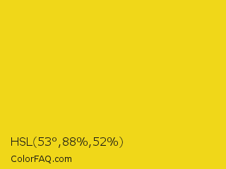 HSL 53°,88%,52% Color is a normal yellow color and the nearest color is Ripe Lemon #f4d81c. Hex code #f0d719 and RGB value is rgb(240,215,25). In RGB color space, this color is composed of 94% red, 84% green, 10% blue, In CMYK color space, this color is composed of 0% cyan, 10% magenta, 90% yellow , 6% black , In HSL color space, this color has a hue angle of 53° , 88% saturation and 52% lightness.