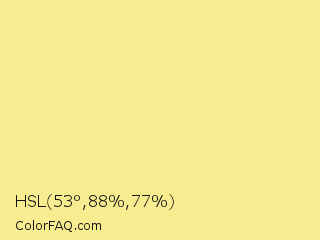 HSL 53°,88%,77% Color is a light yellow color and the nearest color is Flavescent #f7e98e. Hex code #f8ec91 and RGB value is rgb(248,236,145). In RGB color space, this color is composed of 97% red, 93% green, 57% blue, In CMYK color space, this color is composed of 0% cyan, 5% magenta, 42% yellow , 3% black , In HSL color space, this color has a hue angle of 53° , 88% saturation and 77% lightness.
