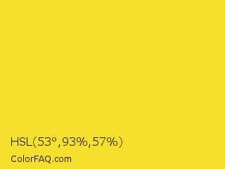 HSL 53°,93%,57% Color is a normal yellow color and the nearest color is Dandelion #f0e130. Hex code #f7e02b and RGB value is rgb(247,224,43). In RGB color space, this color is composed of 97% red, 88% green, 17% blue, In CMYK color space, this color is composed of 0% cyan, 9% magenta, 83% yellow , 3% black , In HSL color space, this color has a hue angle of 53° , 93% saturation and 57% lightness.