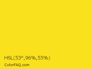 HSL 53°,96%,55% Color is a normal yellow color and the nearest color is Candlelight #fcd917. Hex code #fae11e and RGB value is rgb(250,225,30). In RGB color space, this color is composed of 98% red, 88% green, 12% blue, In CMYK color space, this color is composed of 0% cyan, 10% magenta, 88% yellow , 2% black , In HSL color space, this color has a hue angle of 53° , 96% saturation and 55% lightness.