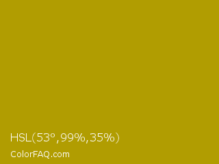HSL 53°,99%,35% Color is a normal yellow color and the nearest color is Buddha Gold #c1a004. Hex code #b19d01 and RGB value is rgb(177,157,1). In RGB color space, this color is composed of 69% red, 62% green, 0% blue, In CMYK color space, this color is composed of 0% cyan, 11% magenta, 99% yellow , 31% black , In HSL color space, this color has a hue angle of 53° , 99% saturation and 35% lightness.