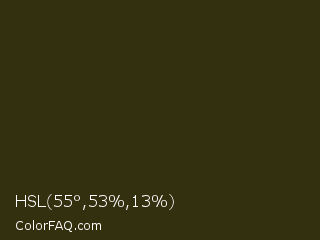 HSL 55°,53%,13% Color is a very dark yellow color and the nearest color is Woodrush #302a0f. Hex code #333010 and RGB value is rgb(51,48,16). In RGB color space, this color is composed of 20% red, 19% green, 6% blue, In CMYK color space, this color is composed of 0% cyan, 6% magenta, 69% yellow , 80% black , In HSL color space, this color has a hue angle of 55° , 53% saturation and 13% lightness.