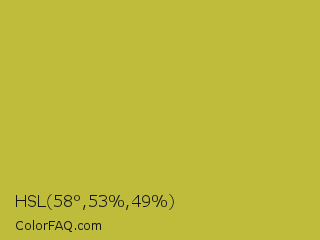 HSL 58°,53%,49% Color is a normal yellow color and the nearest color is Earls Green #c9b93b. Hex code #bfbb3b and RGB value is rgb(191,187,59). In RGB color space, this color is composed of 75% red, 73% green, 23% blue, In CMYK color space, this color is composed of 0% cyan, 2% magenta, 69% yellow , 25% black , In HSL color space, this color has a hue angle of 58° , 53% saturation and 49% lightness.