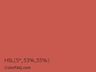HSL 5°,53%,55% Color is a normal red color and the nearest color is Cedar Chest #c95a49. Hex code #c9594f and RGB value is rgb(201,89,79). In RGB color space, this color is composed of 79% red, 35% green, 31% blue, In CMYK color space, this color is composed of 0% cyan, 56% magenta, 61% yellow , 21% black , In HSL color space, this color has a hue angle of 5° , 53% saturation and 55% lightness.