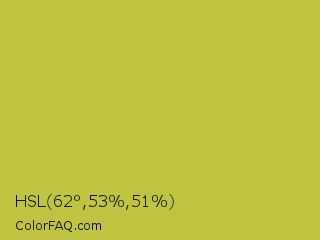 HSL 62°,53%,51% Color is a normal yellow color and the nearest color is Earls Green #c9b93b. Hex code #c0c440 and RGB value is rgb(192,196,64). In RGB color space, this color is composed of 75% red, 77% green, 25% blue, In CMYK color space, this color is composed of 2% cyan, 0% magenta, 67% yellow , 23% black , In HSL color space, this color has a hue angle of 62° , 53% saturation and 51% lightness.