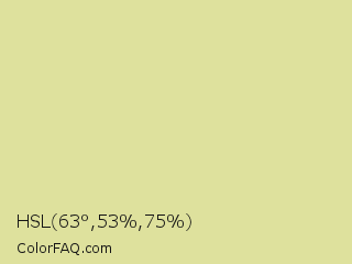 HSL 63°,53%,75% Color is a light yellow color and the nearest color is Zombie #e4d69b. Hex code #dee19d and RGB value is rgb(222,225,157). In RGB color space, this color is composed of 87% red, 88% green, 62% blue, In CMYK color space, this color is composed of 1% cyan, 0% magenta, 30% yellow , 12% black , In HSL color space, this color has a hue angle of 63° , 53% saturation and 75% lightness.