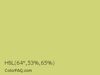 HSL 64°,53%,65% Color is a light yellow color and the nearest color is Yellow Green #c5e17a. Hex code #cfd576 and RGB value is rgb(207,213,118). In RGB color space, this color is composed of 81% red, 84% green, 46% blue, In CMYK color space, this color is composed of 3% cyan, 0% magenta, 45% yellow , 16% black , In HSL color space, this color has a hue angle of 64° , 53% saturation and 65% lightness.
