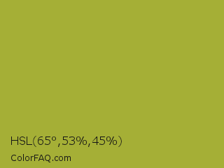 HSL 65°,53%,45% Color is a normal yellow color and the nearest color is Brass #b5a642. Hex code #a5af36 and RGB value is rgb(165,175,54). In RGB color space, this color is composed of 65% red, 69% green, 21% blue, In CMYK color space, this color is composed of 6% cyan, 0% magenta, 69% yellow , 31% black , In HSL color space, this color has a hue angle of 65° , 53% saturation and 45% lightness.