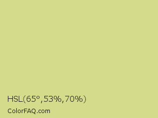 HSL 65°,53%,70% Color is a light yellow color and the nearest color is Medium Spring Bud #c9dc87. Hex code #d4db8a and RGB value is rgb(212,219,138). In RGB color space, this color is composed of 83% red, 86% green, 54% blue, In CMYK color space, this color is composed of 3% cyan, 0% magenta, 37% yellow , 14% black , In HSL color space, this color has a hue angle of 65° , 53% saturation and 70% lightness.