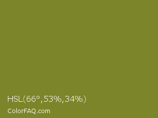 HSL 66°,53%,34% Color is a normal yellow color and the nearest color is Wasabi #788a25. Hex code #7c8529 and RGB value is rgb(124,133,41). In RGB color space, this color is composed of 49% red, 52% green, 16% blue, In CMYK color space, this color is composed of 7% cyan, 0% magenta, 69% yellow , 48% black , In HSL color space, this color has a hue angle of 66° , 53% saturation and 34% lightness.