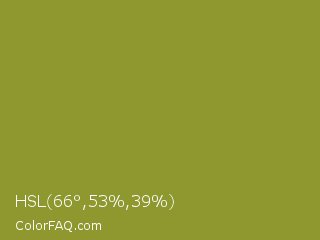 HSL 66°,53%,39% Color is a normal yellow color and the nearest color is Sycamore #908d39. Hex code #8e982f and RGB value is rgb(142,152,47). In RGB color space, this color is composed of 56% red, 60% green, 18% blue, In CMYK color space, this color is composed of 7% cyan, 0% magenta, 69% yellow , 40% black , In HSL color space, this color has a hue angle of 66° , 53% saturation and 39% lightness.