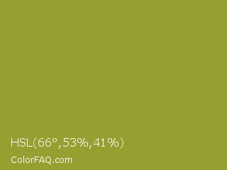 HSL 66°,53%,41% Color is a normal yellow color and the nearest color is Sushi #87ab39. Hex code #95a031 and RGB value is rgb(149,160,49). In RGB color space, this color is composed of 58% red, 63% green, 19% blue, In CMYK color space, this color is composed of 7% cyan, 0% magenta, 69% yellow , 37% black , In HSL color space, this color has a hue angle of 66° , 53% saturation and 41% lightness.