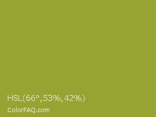 HSL 66°,53%,42% Color is a normal yellow color and the nearest color is Sushi #87ab39. Hex code #98a432 and RGB value is rgb(152,164,50). In RGB color space, this color is composed of 60% red, 64% green, 20% blue, In CMYK color space, this color is composed of 7% cyan, 0% magenta, 70% yellow , 36% black , In HSL color space, this color has a hue angle of 66° , 53% saturation and 42% lightness.