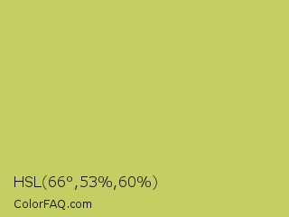 HSL 66°,53%,60% Color is a normal yellow color and the nearest color is Wild Willow #b9c46a. Hex code #c4cf63 and RGB value is rgb(196,207,99). In RGB color space, this color is composed of 77% red, 81% green, 39% blue, In CMYK color space, this color is composed of 5% cyan, 0% magenta, 52% yellow , 19% black , In HSL color space, this color has a hue angle of 66° , 53% saturation and 60% lightness.